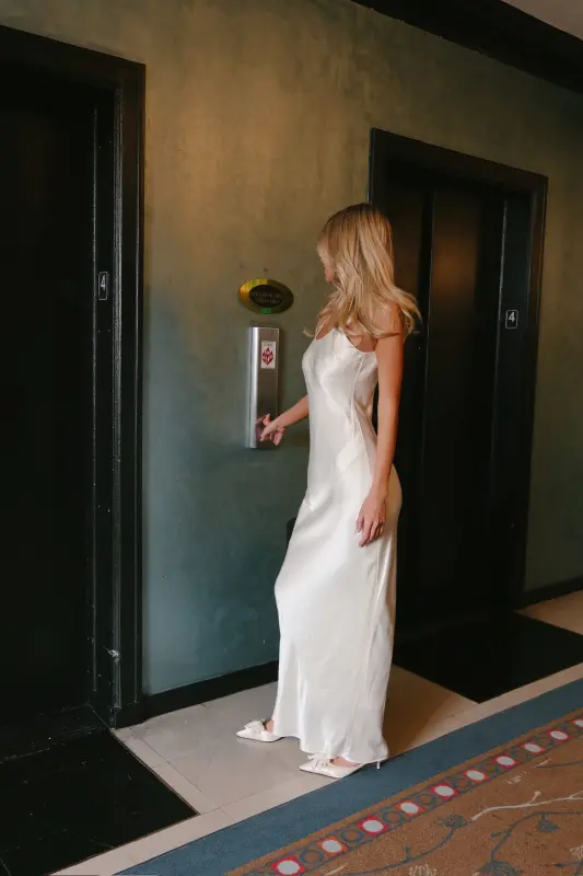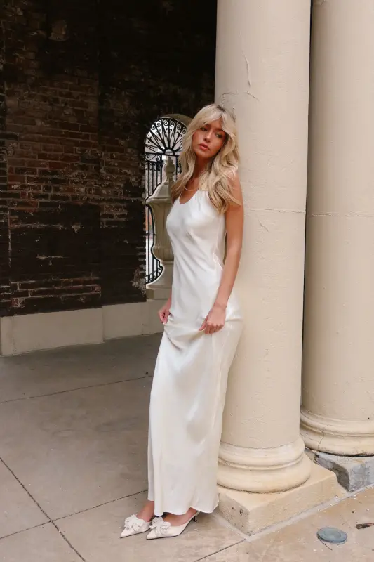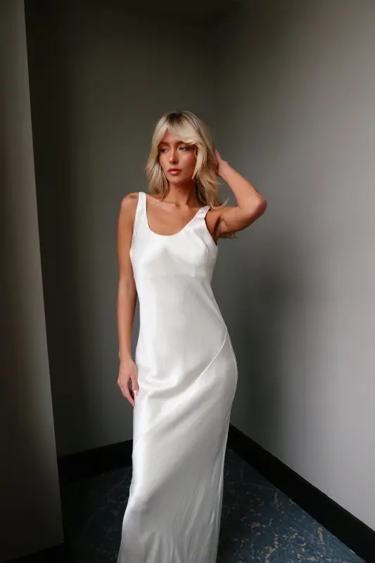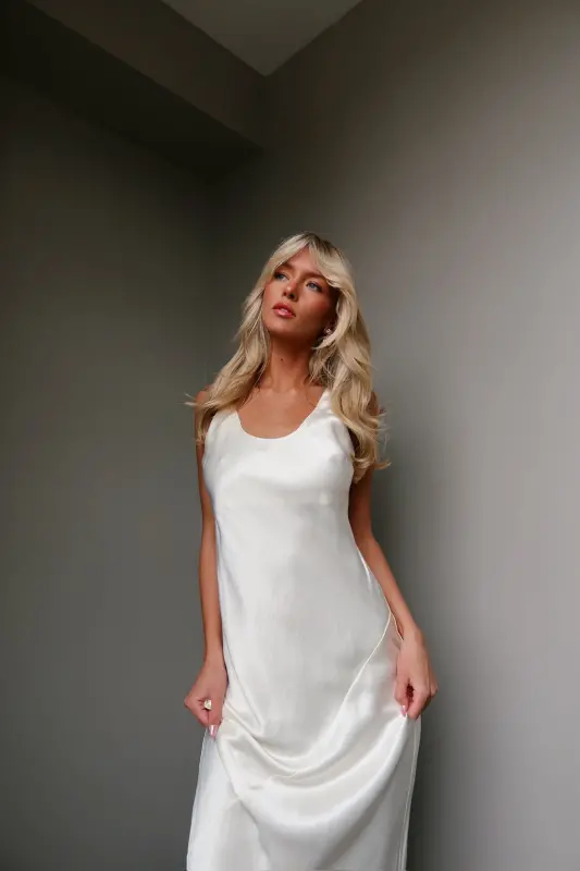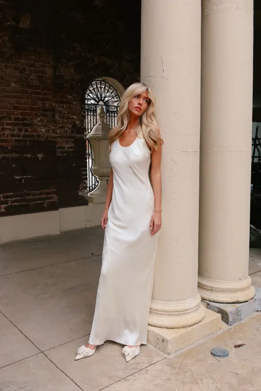 Discover elegance personified in our Adeline Ivory Satin Maxi Dress, a timeless addition to your wardrobe but limited edition to our site. This exquisite dress boasts a classic scoop neckline complemented by fixed straps for effortless sophistication. Adding a subtle yet captivating detail, a delicate stitching runs diagonally halfway down the dress. Crafted with meticulous attention to detail, this dress is fully lined and offers a true-to-size fit, ensuring both comfort and style. Embrace timeless charm and make a statement at any occasion with this stunning maxi dress.