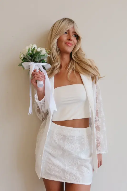 Transform your wardrobe with our Kianna Sheer Floral Blazer and Skirt Set, your ultimate ensemble for chic brunches and elegant summer occasions. This dynamic duo combines a relaxed-fitting, sheer blazer-style top with a fitted, high-rise mini skirt for a flawless look. The blazer features a solid white neckline and intricate rose floral embroidery throughout its sheer body, exuding effortless charm. Complete with a button front closure, it adds a touch of sophistication to any outfit. Elevate your summer wardrobe with this stunning set that effortlessly blends style and sophistication.