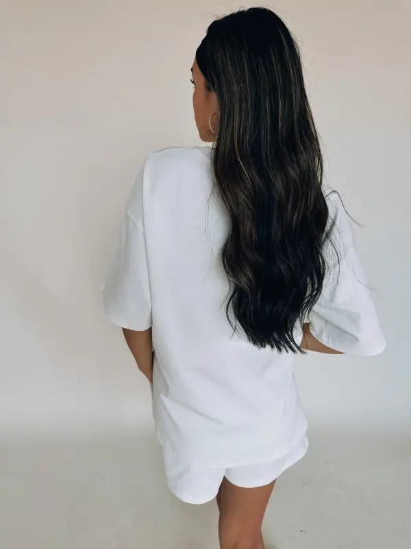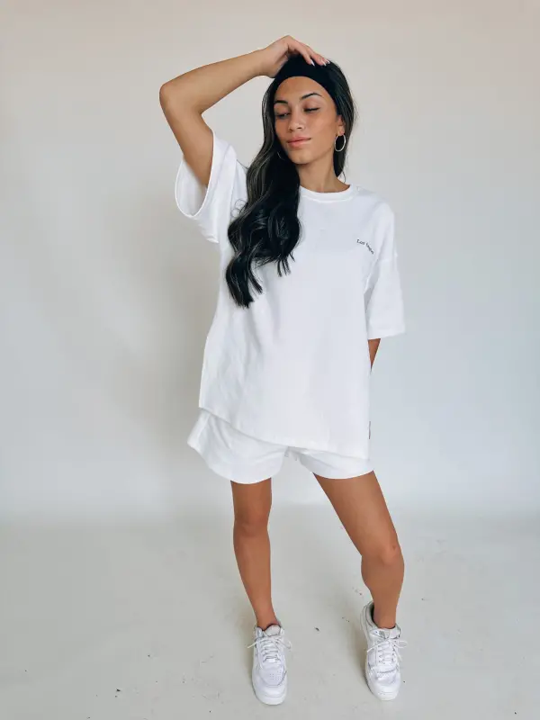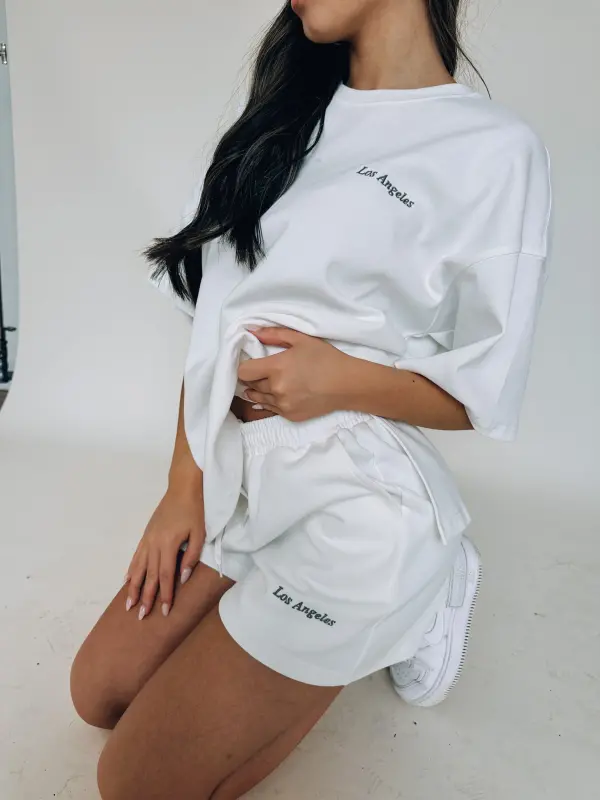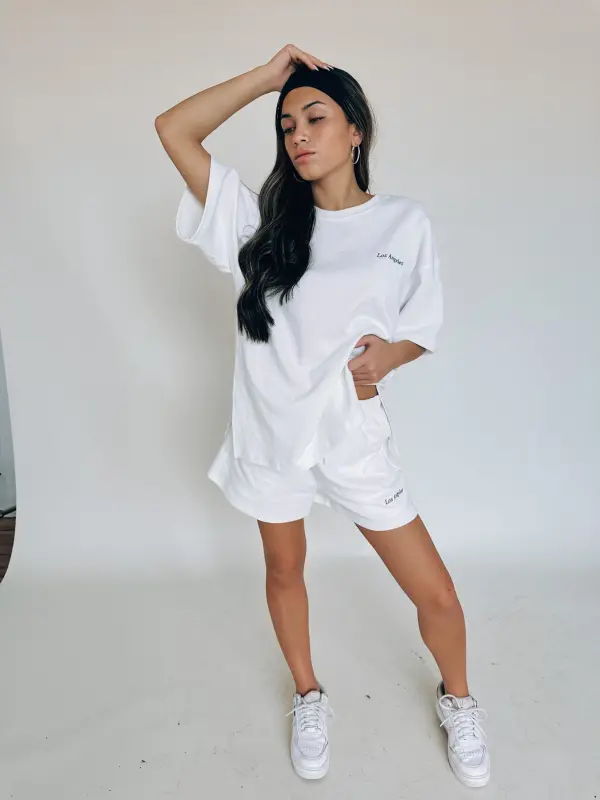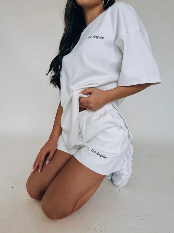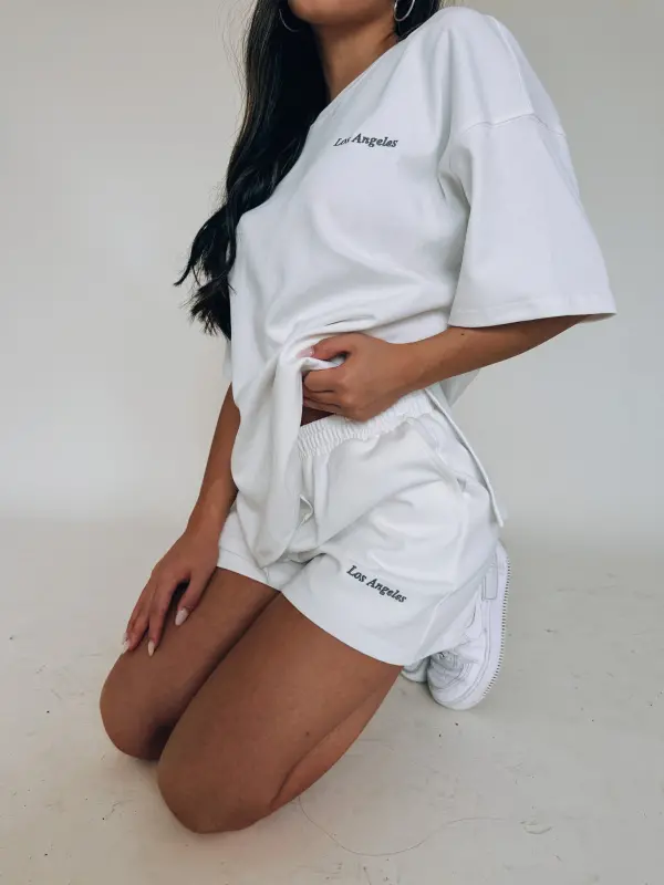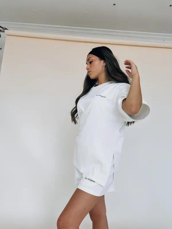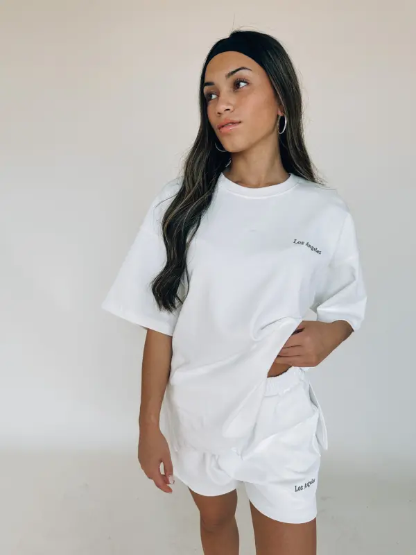 Our Los Angeles Oversized Lounge Set is a white oversized t-shirt with a short. This set is a thick, soft material that is so soft. The top has “Los Angeles” embroidered on the top left side. The shorts feature an elastic waistband, functional pockets, and “Los Angeles” embroidered on the bottom left leg near the hemline.
