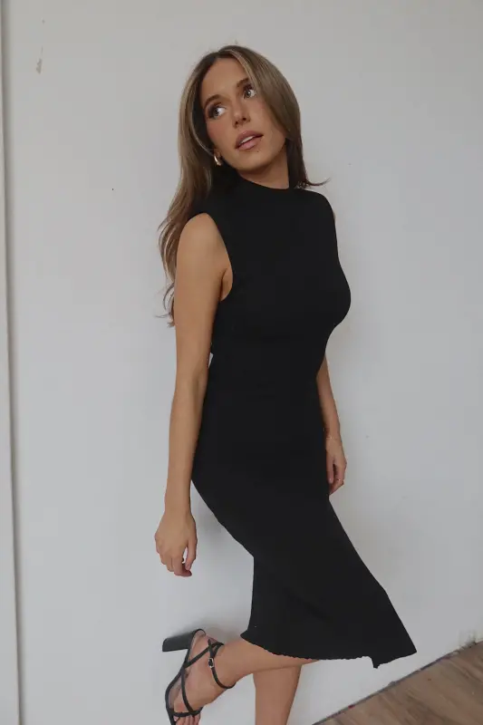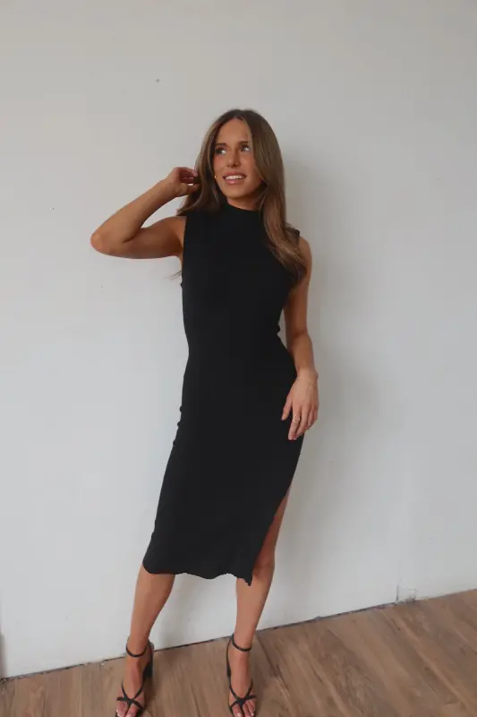 Our Mia Sleeveless Midi Dress In Black has a soft knitted fabric with ribbing detail on the bottom. This high neck item has padded shoulders as well. There is a side slit on this dress as well.