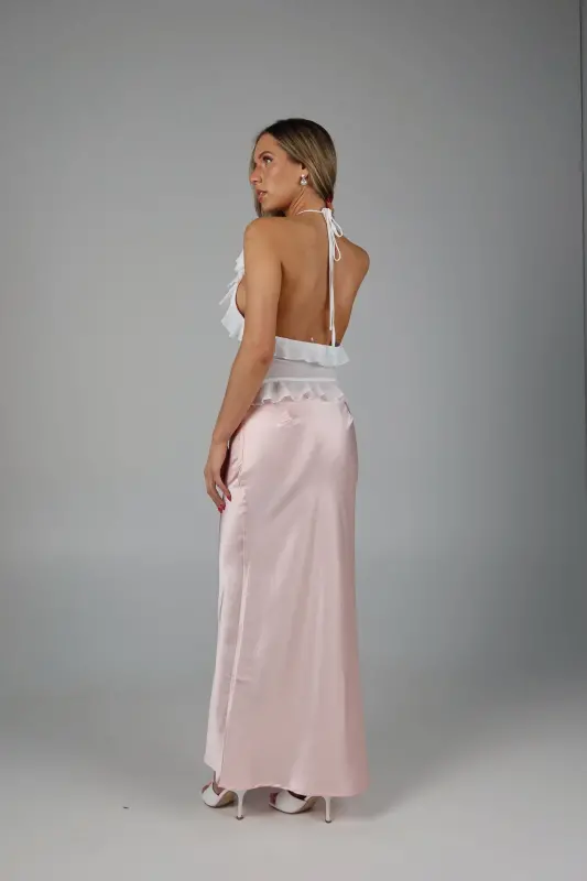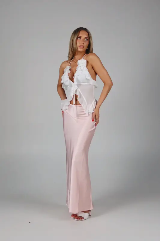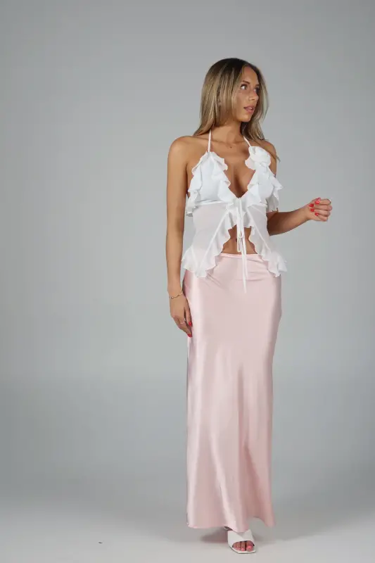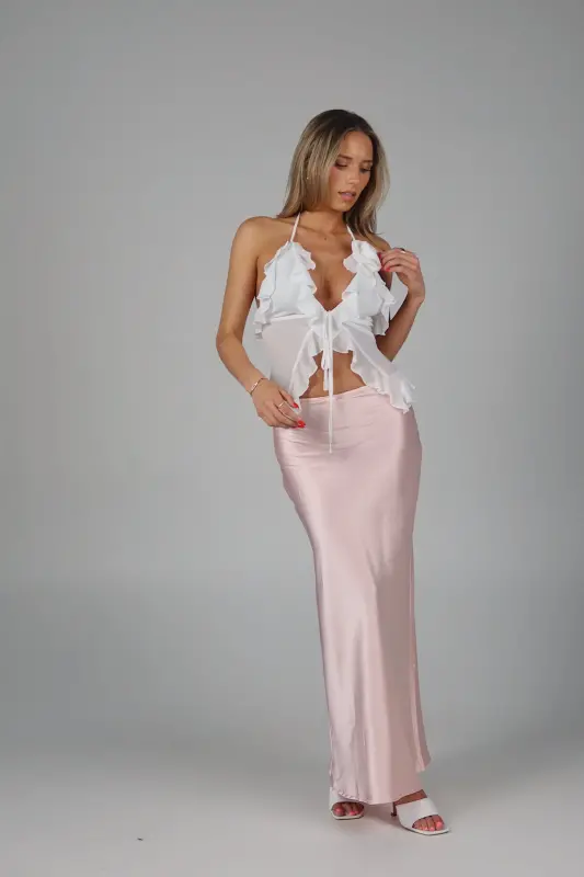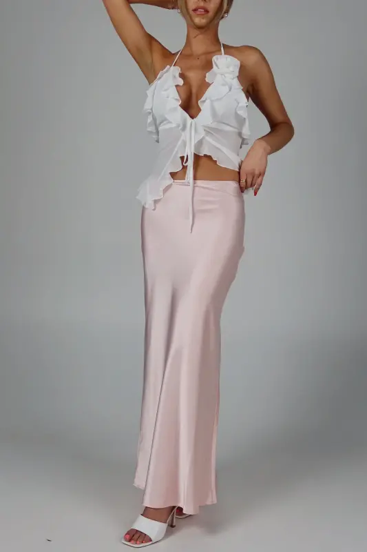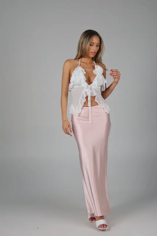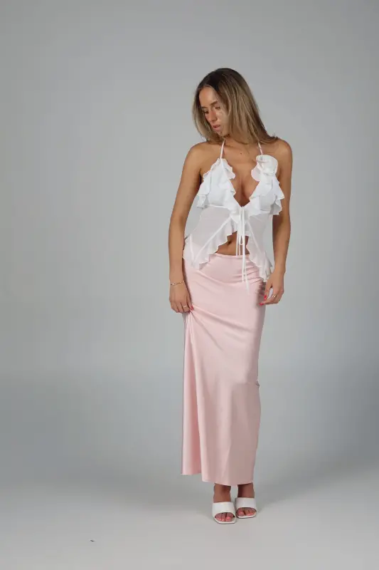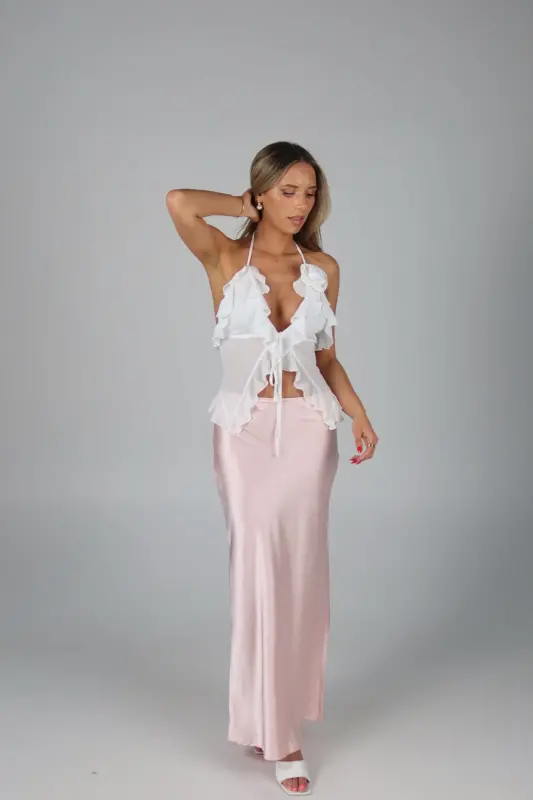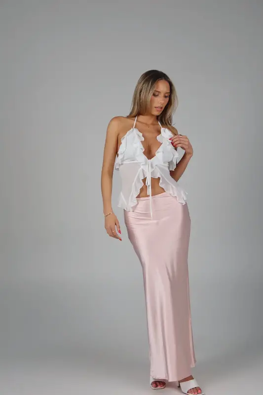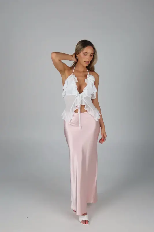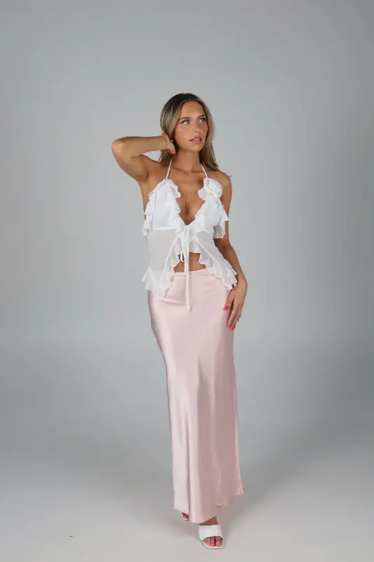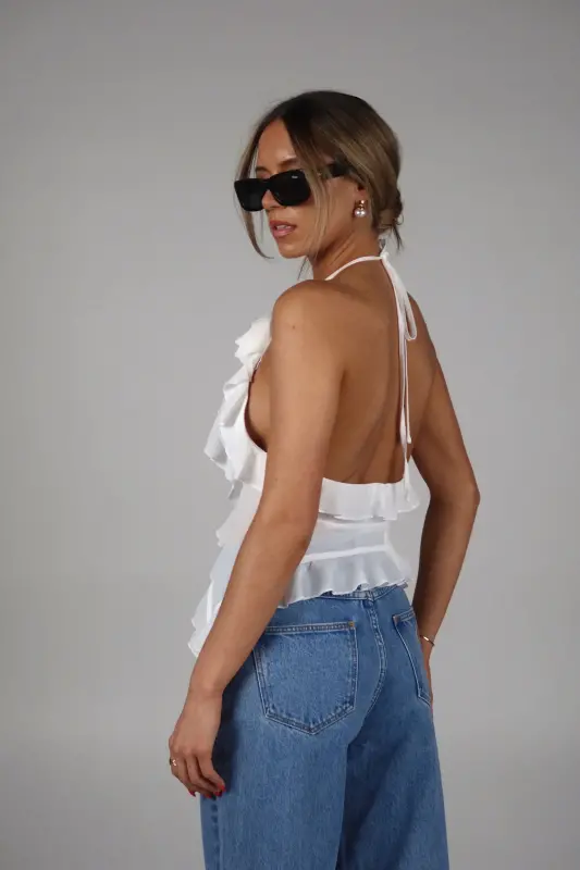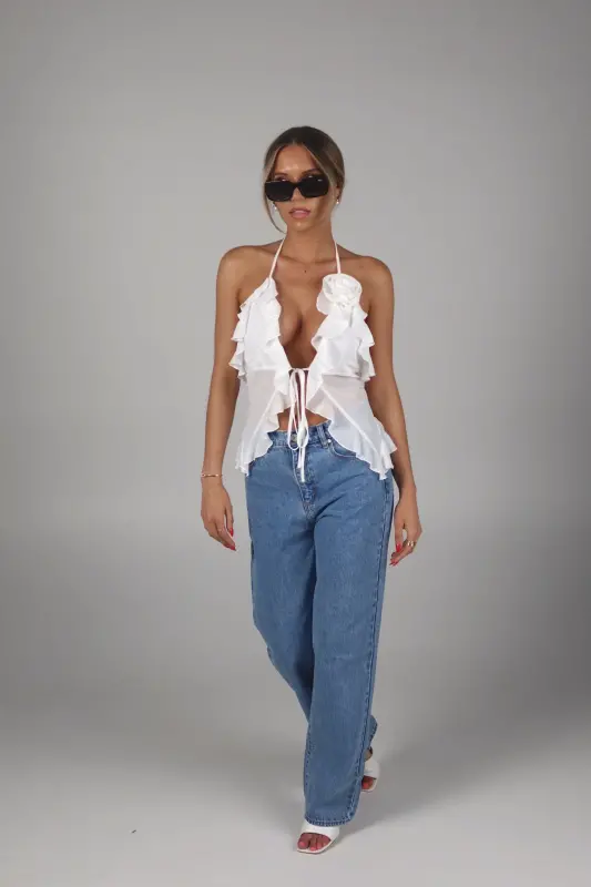 Exude elegance and grace with our Rosalynn Halter Top, a perfect blend of sophistication and charm. This exquisite top features a deep V-neck with a front tie closure in the bust, adding a touch of allure and style to your look. The ruffle trim, chiffon fabric ,and delicate rosette accent enhance its feminine appeal, creating a romantic and whimsical aesthetic. Designed with halter-style ties at the neckline, this top provides a secure and flattering fit, showcasing your shoulders beautifully. Lined at the bust for added comfort and modesty, the sheer chiffon fabric offers a light and airy feel, making it ideal for any warm-weather occasion. Pair it with your favorite skirt, jeans, or tailored pants for a versatile and chic ensemble. Perfect for garden parties, date nights, or special events, the White Sheer Chiffon Top is your go-to piece for an effortlessly elegant and stylish look.