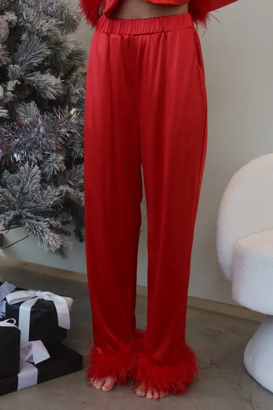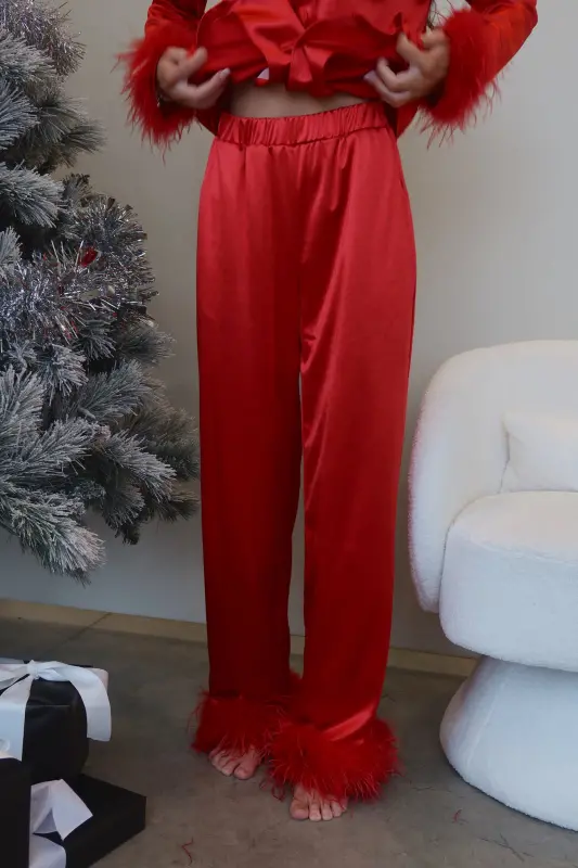 Our Santa Baby Satin Pajama Set includes a button down top and bottoms. This set is a bright & cheery red satin collared neckline with 4 big buttons down top with very fun red feather-trim on the cuffs and the hemline of the pants. The pants have an elastic waistband with two front pockets. This set is so comfy and fits true to size.