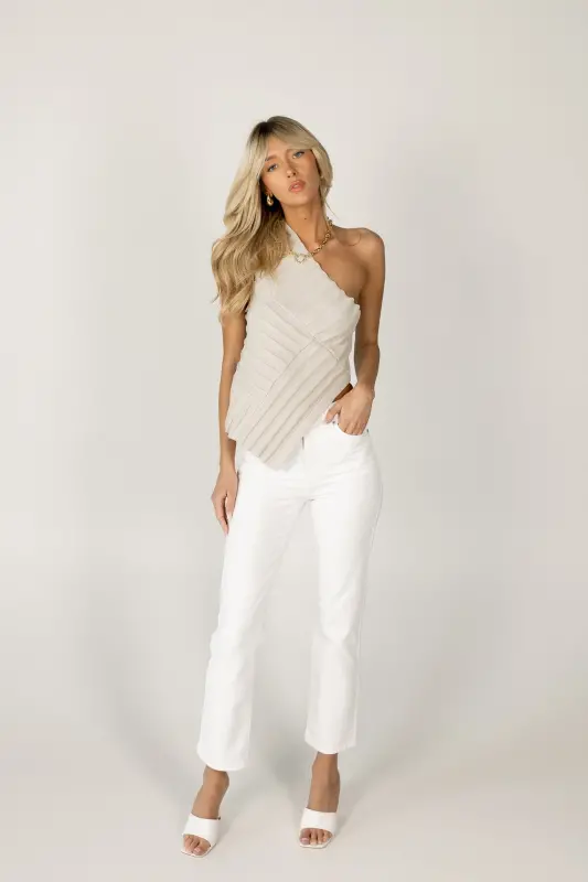 Introducing our taupe colored Taylor One Shoulder Asymmetrical Hem Top, designed to enhance your silhouette with its flattering design. Featuring a contrasting ribbed band and an angular asymmetrical hemline, this top exudes modern sophistication. A versatile addition to your transitional knit wardrobe, it effortlessly combines style and comfort. With its stretchy fabric ensuring a true-to-size fit, this top is perfect for any occasion, whether you're dressing it up or keeping it casual.