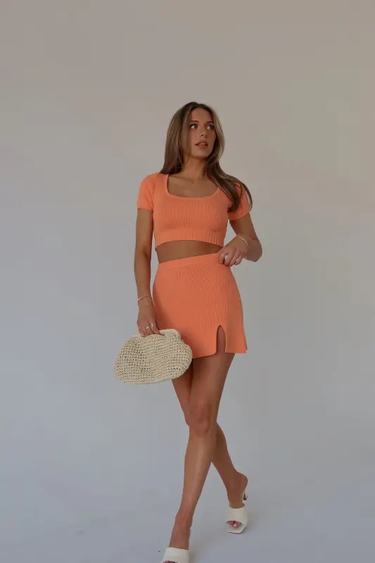 Presenting our Tia Orange Knit Top And Skirt Set – a versatile ensemble that’s sure to elevate your style! This orange colored two-piece set includes a short sleeve cropped top and a fitted mini skirt, both crafted from ribbed knitted fabric for a chic look and comfortable feel. The top features a classic round neck with cap sleeves and a thick ribbed hemline, while the skirt boasts a fitted silhouette with an elastic waistband and a small side slit for added flair. With plenty of stretch and a true-to-size fit, this set offers both comfort and style for any occasion.